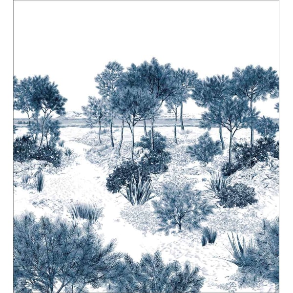 Dune panel is an invitation to a trip on the Atlantic coast in the heart of a wooded dune landscape. Rocked by the wind, the pines wave their needles, bushes of plants and grass are spread among the dunes looking out onto the sea in the distance. This soothing monochrome decor, created by Isidore Leroy, features a deep perspective which leads to a relaxed and peaceful state.
