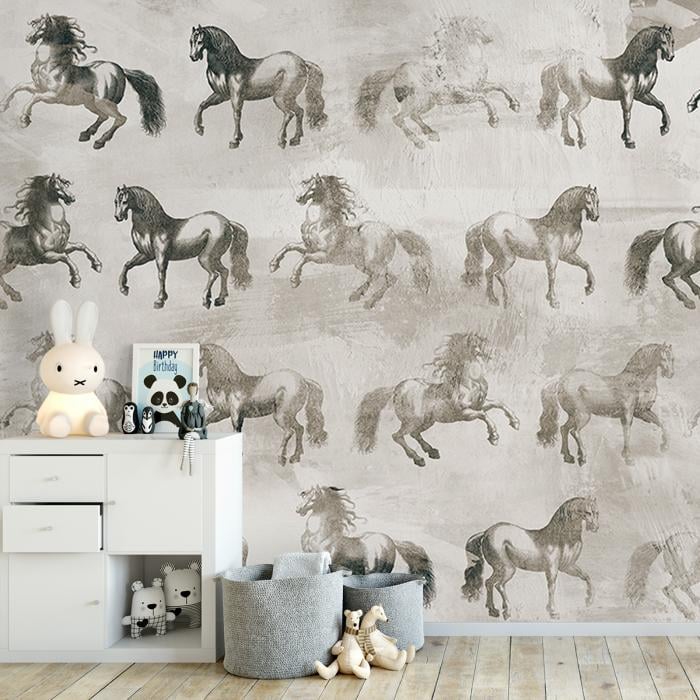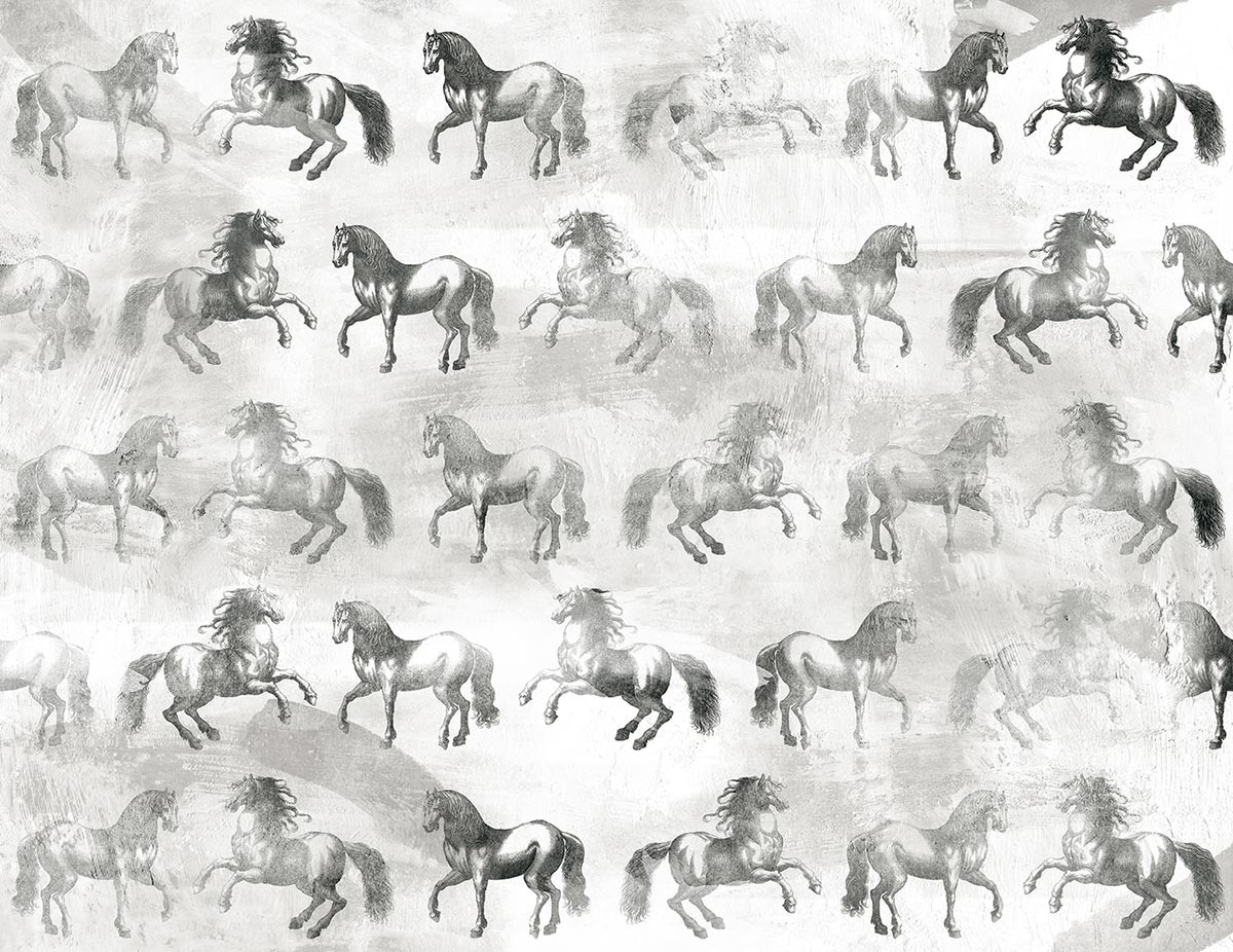 Tres Tintas depicts the appearance of horses as the motif of the Equinae Panel. The equines are presented with their own steps, step, trot, gallop, squid or frolic, here and there. This equestrian show is drawn with a faded effect to mimic the appearance of a monochrome canvas.