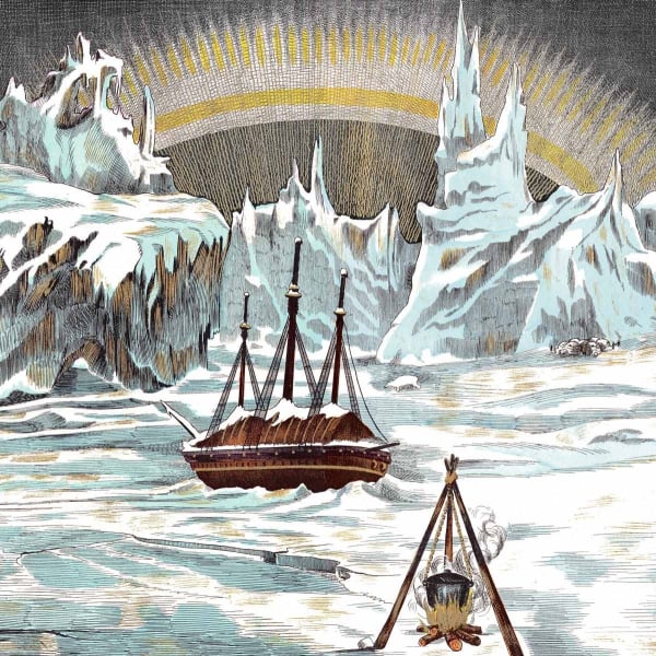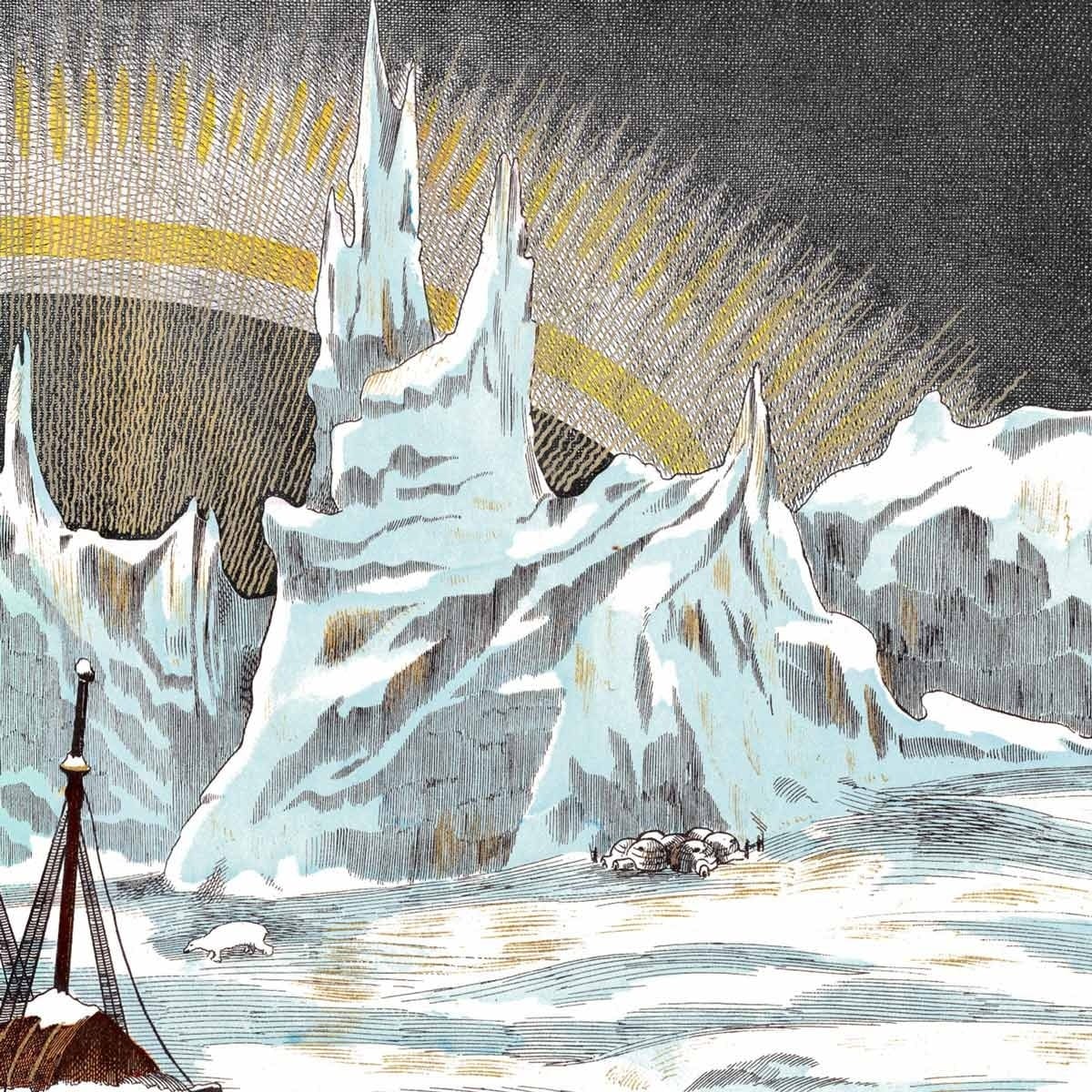 Drawn from archival boards of Epinal's images dating back from 1880 and constituting the theatre background setting called "Arctic Wintering" this panoramic view of an ice-captive ship is striking. Nourishing the imagination, this scene leads into an extreme adventure in the heart of a grandiose and isolated landscape allowing all dreams in the magic glow of twilight.