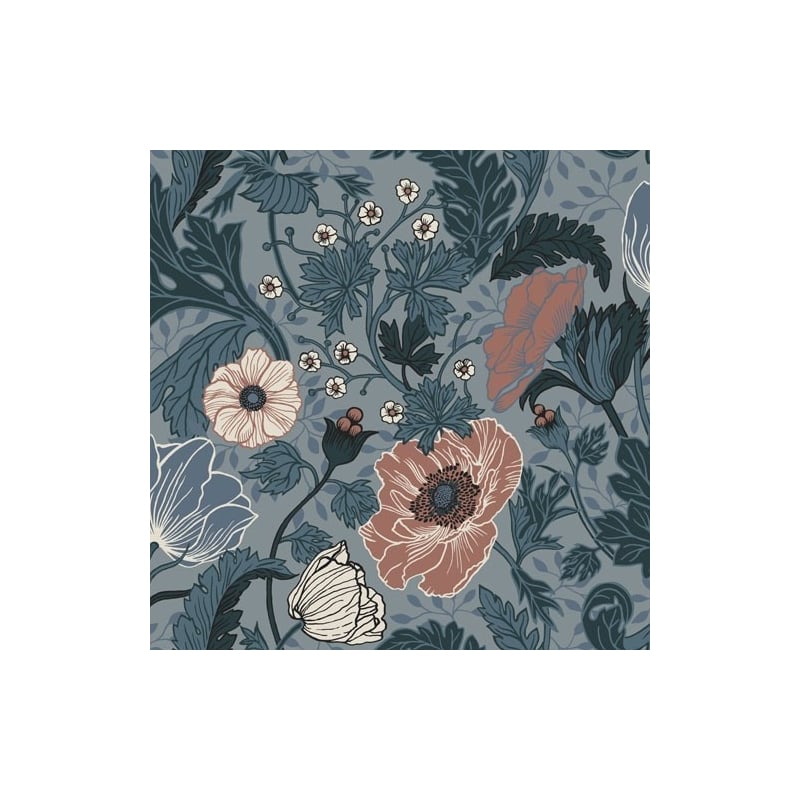 Soft colors make up the floral design of the Anemone wallpaper. They bring a realistic touch to the pattern formed by poppies, tulips and leaves while contrasting with the plain background. This wall decoration from the Apelviken collection gives a romantic touch to any living space.