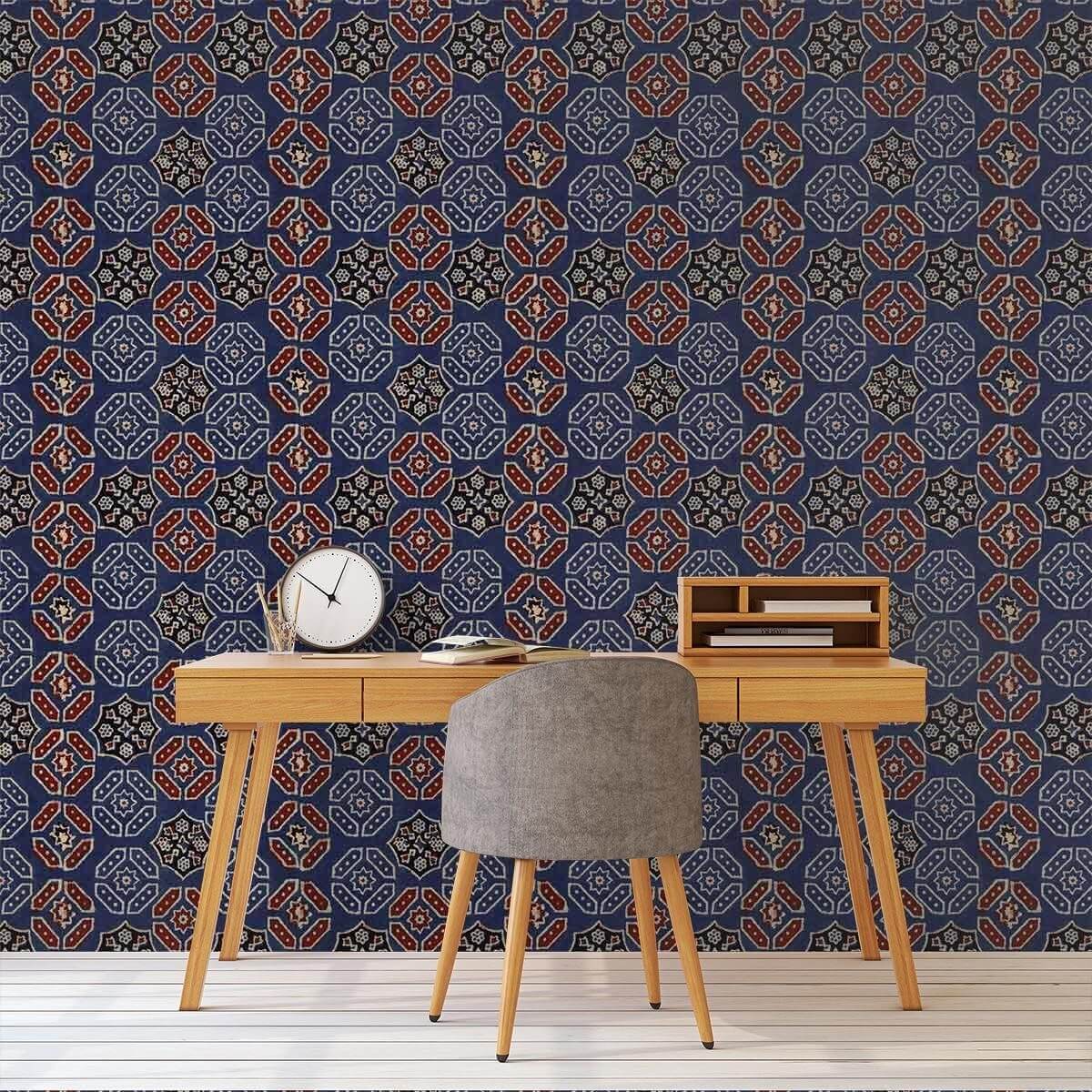 The geometric design of Ajrak wallpaper is inspired by traditional patterns printed by wooden blocks made by an Indian people living in the ancient Shindi culture. It features figures of stars surrounded by cobblestones on a solid background. The set comes in a palette of bright colors bringing an oriental touch to any space.