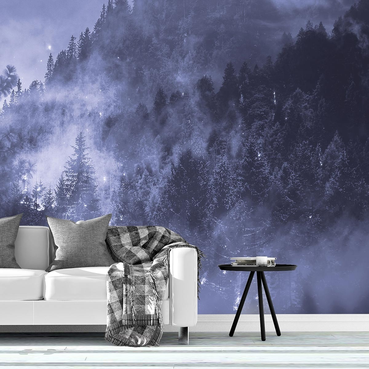 Large fir trees on the side of a mountain make up the rustic motif of the Sapin panel. Lit by a starry sky, the lush foliage of these trees evokes the appearance of an enchanted forest. Available in a navy, sepia or black and white color with a brushed look, this sumptuous Stella Cadente covering brings poetry to spaces.