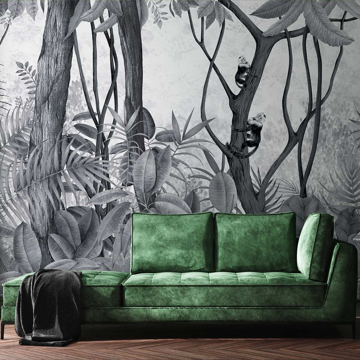 Illustrating a tropical pattern, Casa de Vidro highlights a dense exotic forest with monkeys perched on trees. Edited by Coordonné, some versions of this model are framed by rectangles which represent windows. This wall covering honors the eponymous house designed by Italian architect Lina Bo Bardi in Sao Paulo.