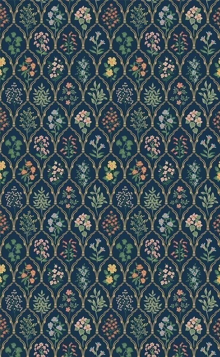 The Hawthorne wallpaper has a floral composition with various plants. Leaves and wild flowers make up this romantic design. For an elegant rendering, they are framed by fine golden arches. This pattern is available in dark and light shades.