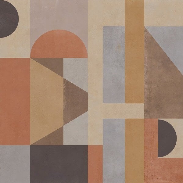 The Geo panel features large geometric figures that overlap. Rectangles, semicircles and trapezoids make up this graphic pattern in soft, bright and neutral colors. Cool, warm and understated tones emphasize the elements, lending a subtle illusion of depth to the whole.