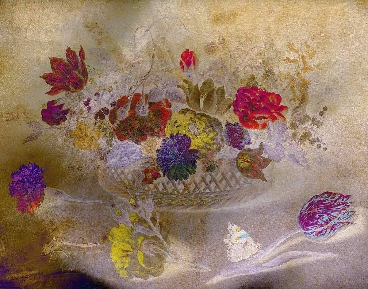 With the Flore 3 panel, Labo Leonard offers a daring and romantic work. Mixing the modern with the old, its pattern brings still life up to date. It depicts a flower basket surrounded by insects. We recognize among others peonies, roses, a butterfly and a dragonfly. The color treatment revolutionizes the whole. Recalling the negative aspect of film photography, bright and colorful tones are added to classic colors and bring contemporaneity to the whole.