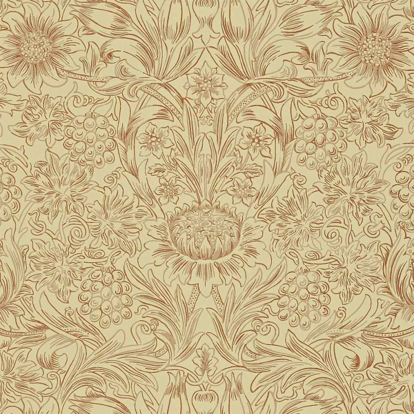Drawn in one color, large sunflowers and vines make up the motif of the Sunflower wallpaper. These plants feature curvilinear leaves and petals detailed with fine streaks, providing an authentic rendering to the illustration. This romantic wall decoration was designed by British designer William Morris in 1879.