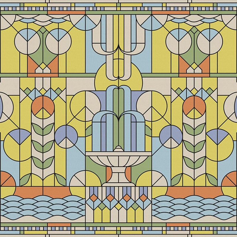This panoramic wall covering is inspired by the charm of stained glass. Pieces of colored glass are arranged to form iconographic patterns, held together by a black outline, transforming the interior by introducing color and light. Rather than serving as an educational tool for the illiterate like the stained glass windows did, this wallpaper nonetheless conveys a message of love.