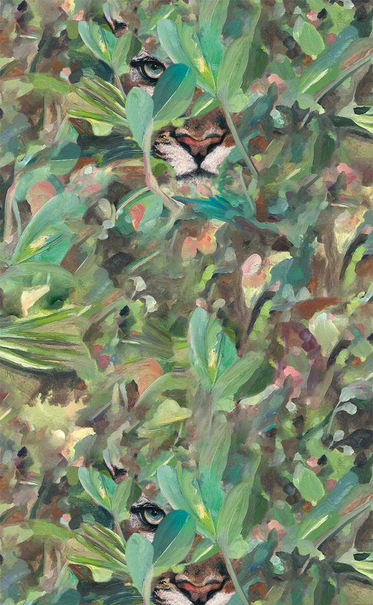 Bring an exotic touch to your living space with the multi-colored design of Coordonné's Hidden Puma wallpaper. Presented in natural colors, a puma covered in lush foliage makes up the pattern. These elements feature lightly faded lines and brush strokes, evoking the look of a painting canvas.