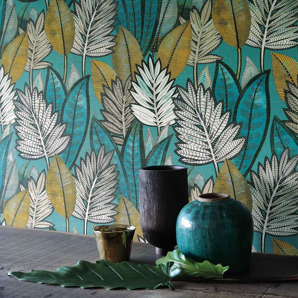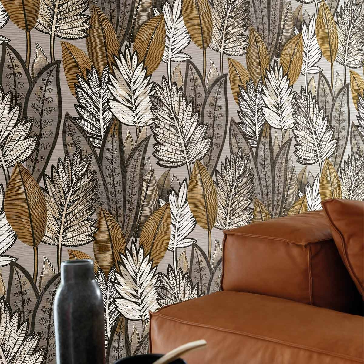 A variety of leaves underlined by dotted lines stand out against the plain background of the Sabal wallpaper. Large in size, they are slightly superimposed. This multicolored work evokes the colors of a forest through the seasons.