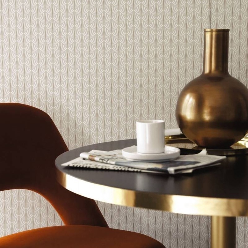 Casamance awakens your curiosity and revives your interior with a note of elegance through its series of palms on Stein. Presented in a small rhombus, the leaves are arranged symmetrically to create a lush design on the plain background. The slightly metallic graphics recall the appearance of a tropical forest.