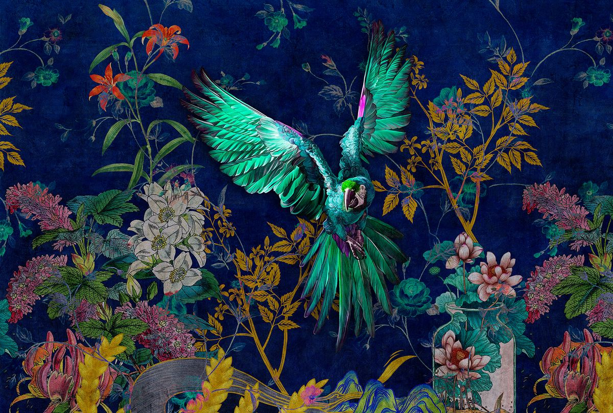 The color scheme used in the design of the Tropical Hero panoramic backdrop gives an authentic look to the patterns. This design by Walls by Patel features a large parrot in flight amidst tropical and flowering vegetation. All of these elements are contrasted with a moiré-like background that resembles velvet.
