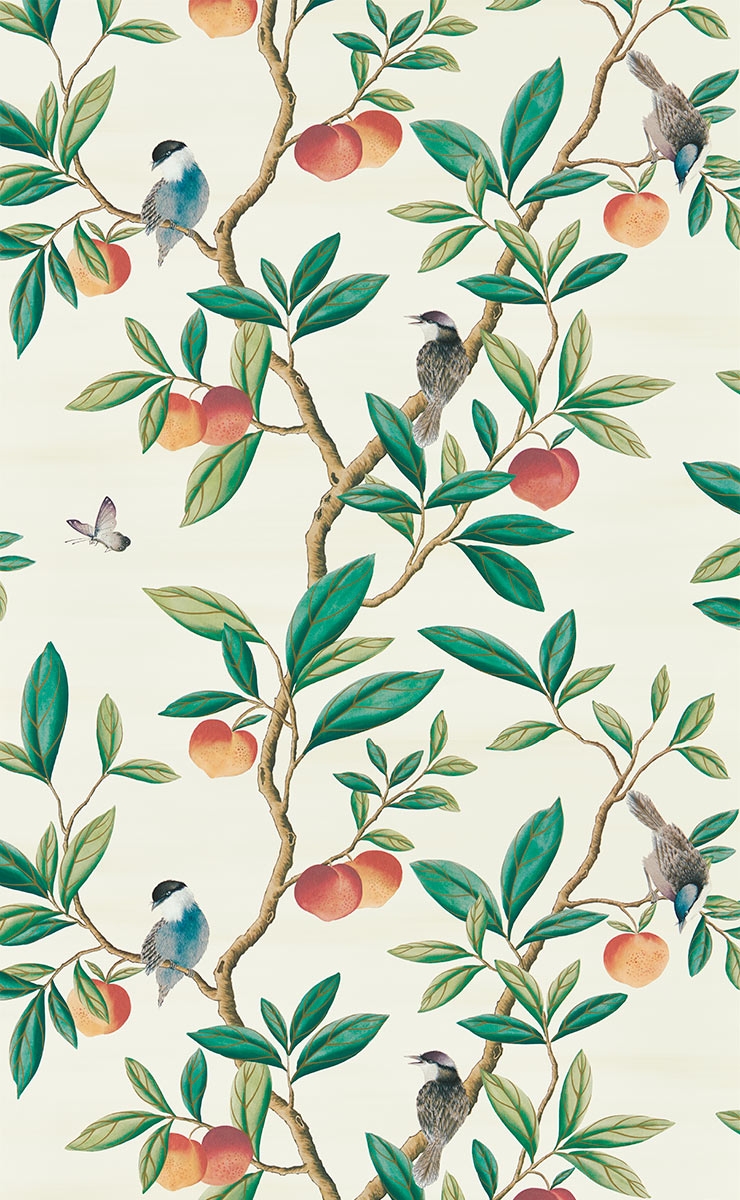 An oriental touch is brought to the walls with the Ella wallpaper and its motif of trees, ripe fruit and stylised birds. This wallpaper, published by Harlequin, is a modern translation of an antique chinoiserie. The vintage style has been kept, and can be felt through the brushed and faded effect of the painting. Classic and timeless, this work takes its name from the jazz singer Ella Fitzgerald.