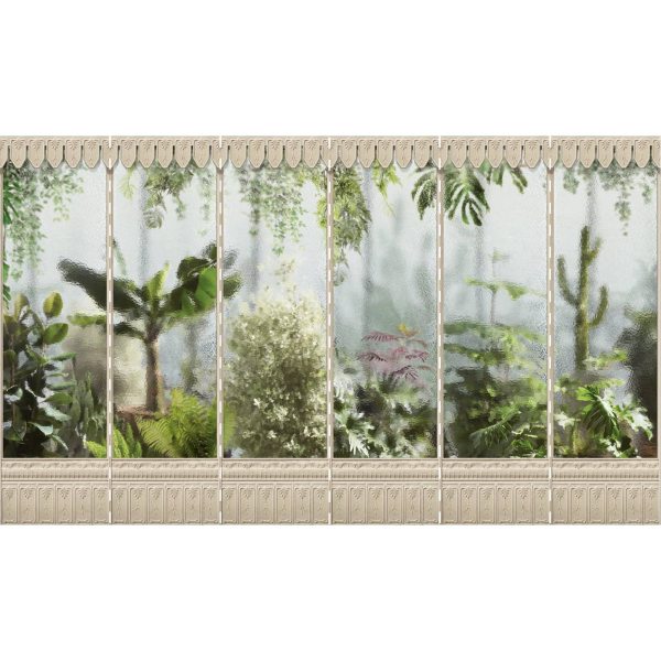 Presented by Koziel, the winter garden panoramic wallpaper, evokes the poetic grace of early 20th-century antique greenhouses, in a style reminiscent of Victorian elegance. The walls, adorned with hammered glass, reveal magnificent succulents, robust shrubs and tropical plants. A subtle contemporary nod to Impressionist art adds magic to the whole. Made in France with a non-woven backing, it's easy to install and long-lasting.