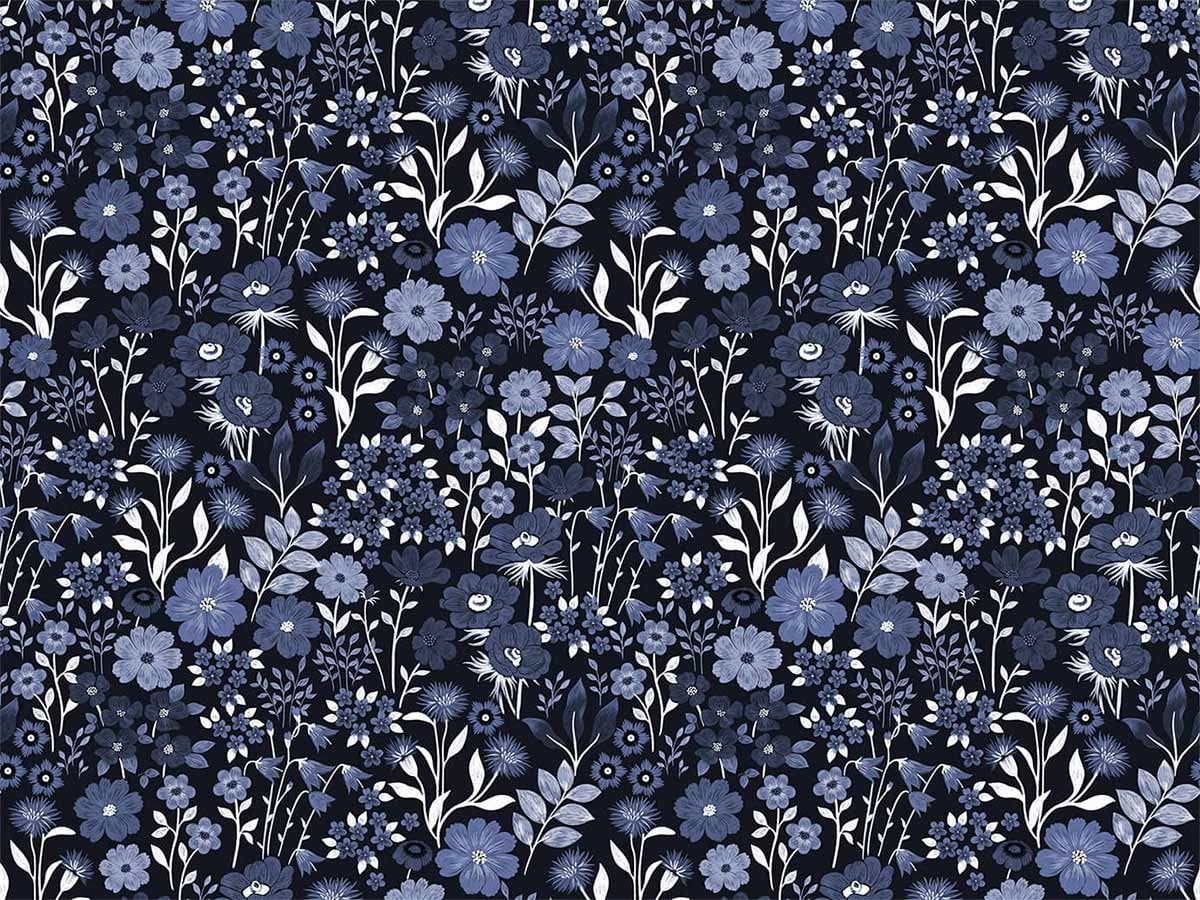 The Fleurs des Champs Luna panoramic wallpaper by Koziel evokes a luxuriant immersion in nature. The small, meticulously detailed flowers create a sumptuous pattern. In a monochrome palette of blues on a midnight blue background, the whole captures a peaceful atmosphere, inviting contemplation and relaxation. Each element of this masterpiece is an ode to the beauty of nature, offering a visual experience rich in exquisite detail.