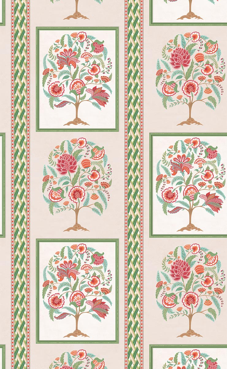 Crafted by Osborne & Little, Taniska evokes the richness of Hindu heritage. Embodying the goddess of gold in her essence, this floral wallpaper is adorned with trees of life designed with a contemporary touch. These trees blend harmoniously with cashmere flowers to form a lush bouquet. The band of lattice borders separating the rows adds structured elegance to the design.
