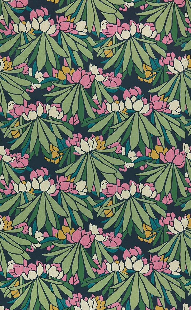 The Rhododendron wallpaper by 1838 is a botanical odyssey, celebrating the majesty of lush leaves and blossoming flowers. Inspired by a woodblock printed sample, it evokes a bewitching retro charm, almost geometric in its captivating symmetry. Using surface printing techniques, its sumptuous colours offer a beautiful painted effect and a rich visual experience.