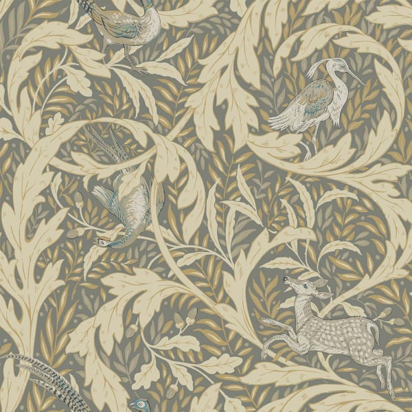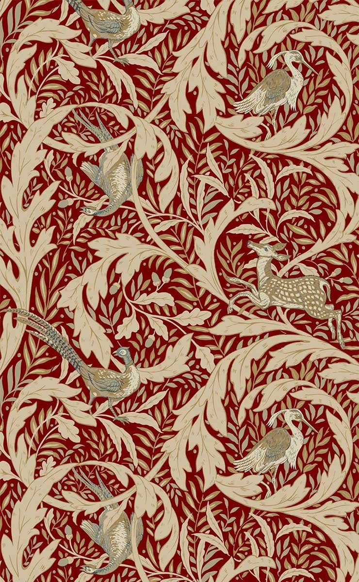 Animaux Forêt wallpaper, designed by Ronald Redding for Initiales, features a forest motif dating from 2022. It depicts herons, acrobatic pheasants and fawns leaping through acanthus branches, against a background of mountain ash. The pattern, inspired by the works of William Morris and Voysey, ennobles the walls with its medieval charm.