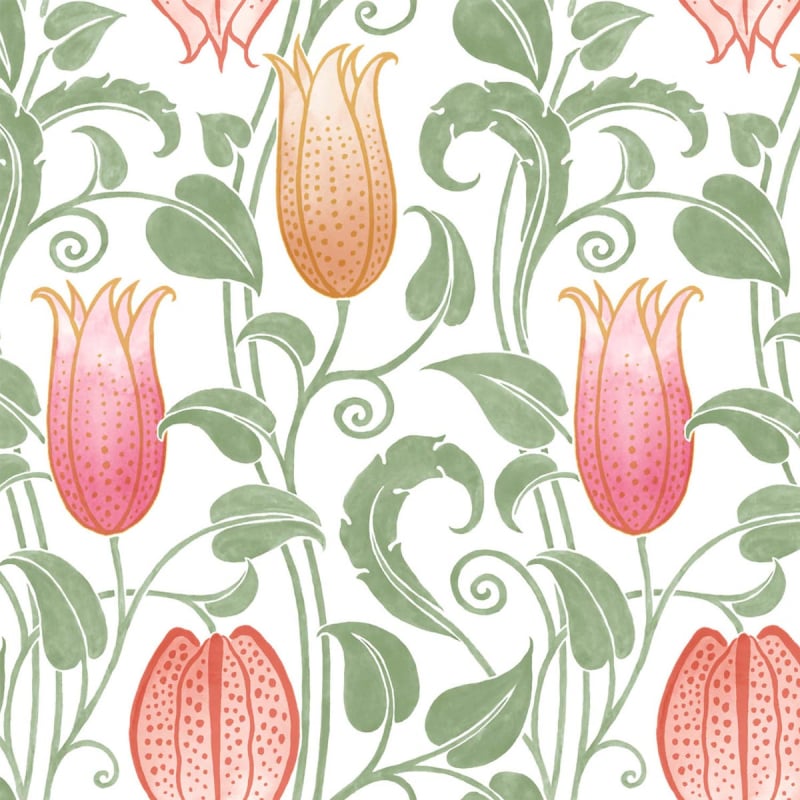 The Tulipe Canterbury wallpaper by Initiales features bell-shaped flowers in cheerful colours, with tendrils climbing to the ceiling. The pattern was created by Ronald Redding, based on the archives of British architect and designer Charles Voysey. The figures appeal for the handcrafted effect of their watercolour finish, as well as the nostalgia of the nineteenth and twentieth centuries.