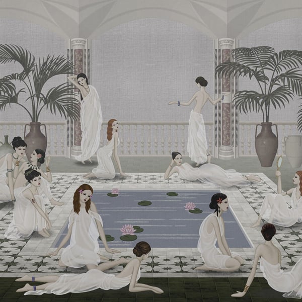 Created by London Art, Les Baigneurs invites us to immerse ourselves in a mythical scene.  In this painting, a group of women relax by a swimming pool, creating an intimate and delicate atmosphere. Produced in warm, matt colours, this panoramic wallpaper reflects the enchanting atmosphere of the Middle East and brings a touch of the exotic to any room.