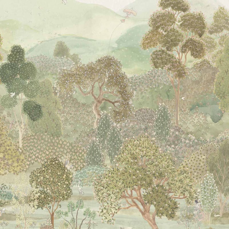 Published by Zoffany, the Lost Lands panoramic wallpaper sketches a teeming fresco. In an imaginary world, trees rustle with dreams and clearings whisper buried memories. This illustrated botanical motif reveals creatures hidden among lush vegetation. Through this scene, the house evokes a childhood bathed in dreams and serenity.