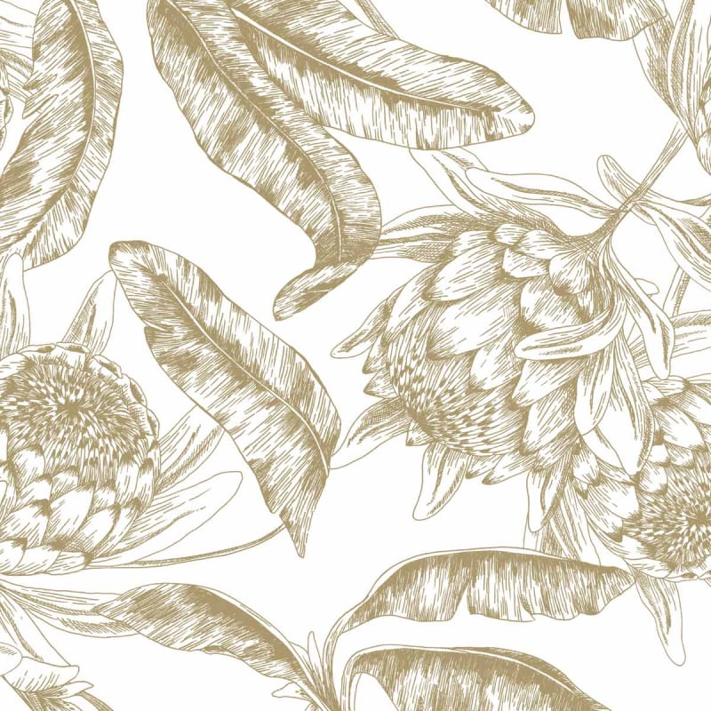 Protea is a wallpaper with an exotic floral pattern, signed Raccord Parfait. Inspired by old engravings, the design features majestic proteas intertwined with large leaves with marked veins. Each hand-drawn flower captures the attention with its chiseled central structure and the precision of its lines. Digital printing reveals the richness of the line, the finesse of the contours and the slightest quivering of the foliage.