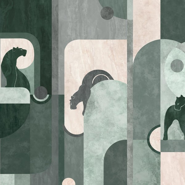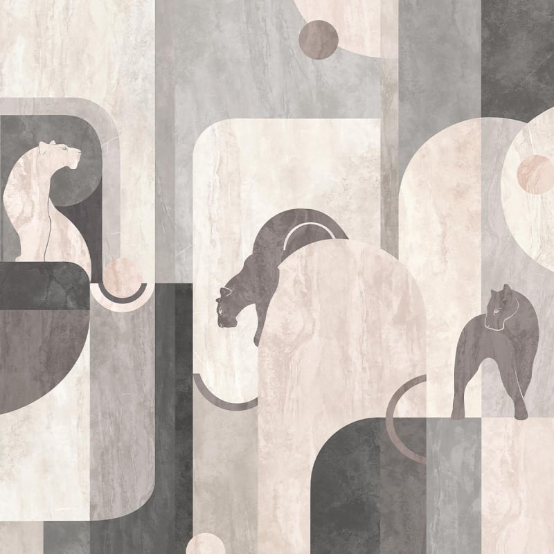 On the panoramic Panthera wallpaper, majestic felines blend into a tangle of arches and structured volumes. The geometric and animal pattern is based on a hand-drawn composition. Sculpted in an arrangement of sober curves, each panther hides or imposes itself on a marbled background. This creation highlights the softness and precision of the lines signed by Les Dominotiers.