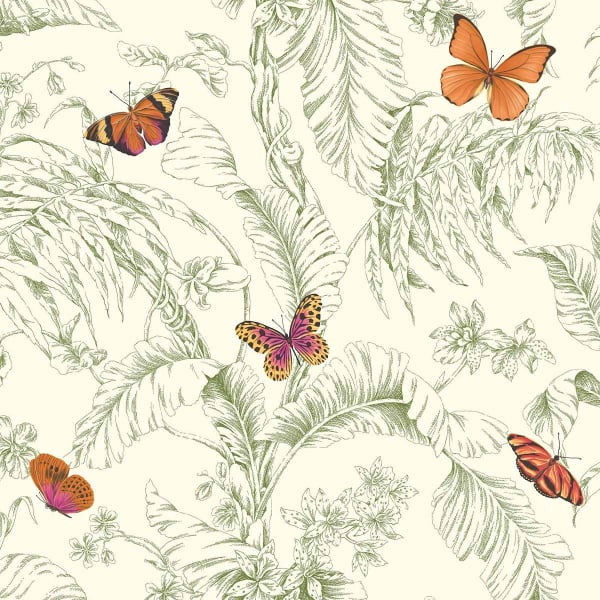 Papillon, signé York Wallcoverings, est un papier peint où des feuillages tropicaux aux nervures fines et entrelacées forment une trame dense et immobile. Au cœur de cette végétation minutieusement détaillée, des papillons colorés semblent figés dans un vol suspendu. Ce décor foisonnant crée un jardin discret, mêlant observation naturaliste et rêverie exotique.