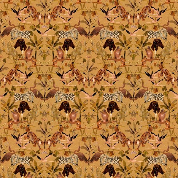 The Échappée Sauvage panoramic wallpaper features a rich and lush jungle pattern, populated by wild animals, tropical birds and undulating foliage. The animals evolve in a suspended universe, between dream nature and illustrated bestiary. Every detail reveals the finesse of the hand drawing, from feline scratches to bright plumage. Designed with respect for the environment, this creation bears the signature of Initiales.