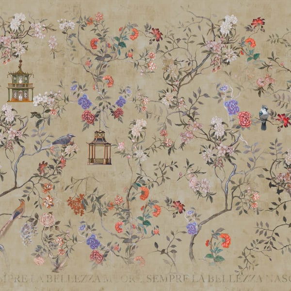 The Oriental Gold panoramic wallpaper explores a dense and poetic botanical scene, inspired by a floral chinoiserie-style pattern. Sinuous branches run through a plain background, where opulent flowers bloom. Perched birds and hanging lamps structure this dream garden with measure. Each element contributes to an atmosphere with the old-world charm unique to Wall&decò.