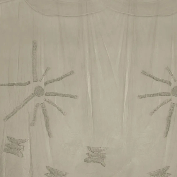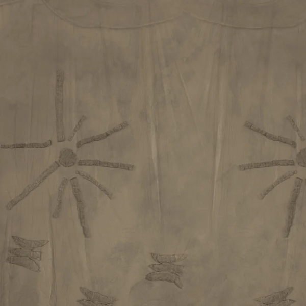 Rebel Walls' Silenzio panoramic wallpaper is inspired by a hand-sewn textile assemblage. The abstract pattern features stylized suns, composed of irregular segments arranged in a circle around a solid center. Below, silhouettes evoke birds in flight. The drawing, rich in texture, seems suspended on a light, almost fluid background.