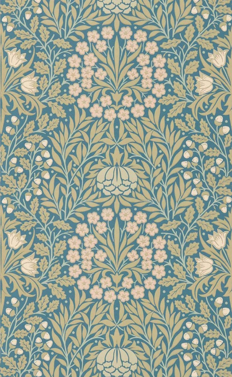 Daisy & Oak wallpaper reveals a stylized floral pattern in a cleverly rhythmic structure, typical of the decorative repertoire of Morris and Co. The leaves stand in geometric bouquets, surrounding flowers with sharp and delicate contours. Daisies, oaks and buds intertwine in a controlled symmetry, revealing a dense, almost ornamental vegetation. The whole composes a lush plant scene, of great richness.