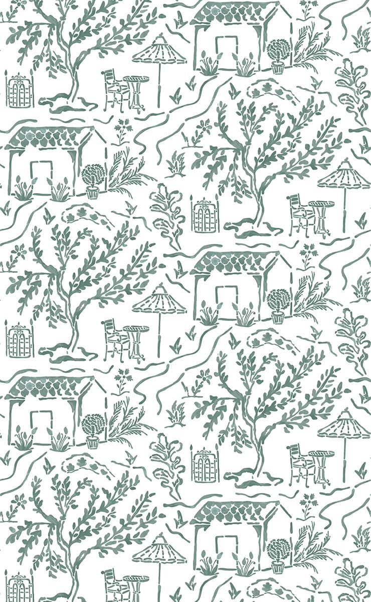 La Quintinie wallpaper unfolds a pictorial motif inspired by a garden imbued with poetry. Winding paths connect sheltered arbors, tables forgotten under parasols and soft foliage. The whole sketches a dream vision of a romantic park, bathed in a soothing calm. This creation by Nina Campbell evokes a suspended elsewhere, all in softness.