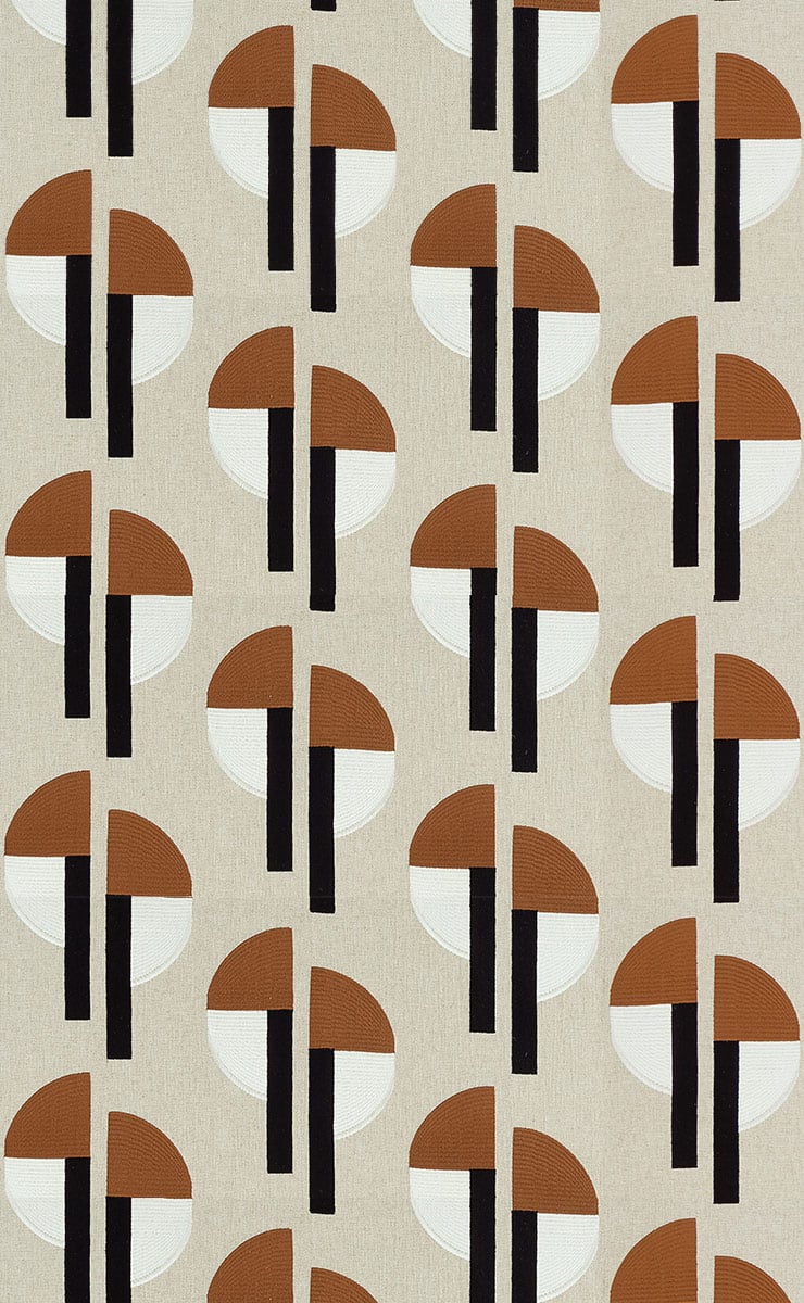 The Selas d'Arte wall covering features a geometric pattern with retro accents. It is composed of half-moons and vertical bands that repeat themselves like a visual score. Two types of embroidery give relief to the design, one dense and circular, the other fine and taut. The composition plays on contrasts and graphic rigor. Natural linen enriches the surface.