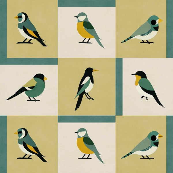 The Like a Bird wallpaper shows an orderly dance of birds, placed on a checkerboard with contrasting hues. Each silhouette, reduced to the essential, is part of a graphic and minimalist register. The repetitive animal pattern composes a regular pattern that evokes a decorative patchwork. This wall covering adorns the space with a structured and expressive illustration.
