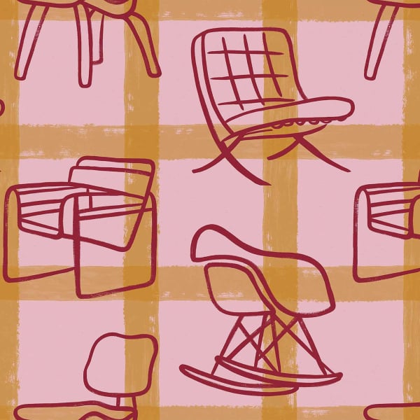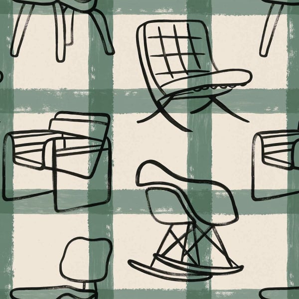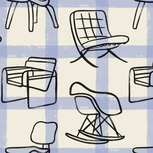 Iconic chairs of the modern style unfold on the Iconicos wallpaper. Drawn with lightness, the figurative pattern with sharp contours extends over a background of irregular checks. Simple and dynamic lines make up the classic armchairs. Coordonnée celebrates design in motion, in a sober and expressive language.