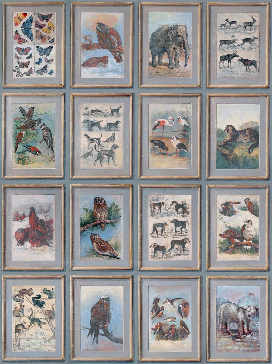 The Zoology wallpaper features naturalistic illustrations arranged like a wall of vintage frames. Each scene, inspired by 19th-century scientific plates, highlights the richness of the animal world. The encyclopedic motif captures the subtle textures of antique engraving. This Andrew Martin design envelops surfaces and creates the illusion of a multitude of meticulously drawn and painted studies.
