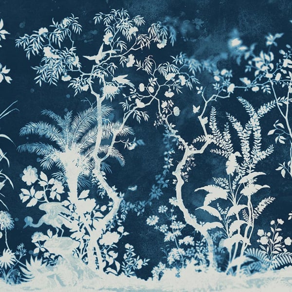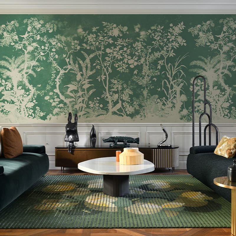 Published by Code, the Inno panoramic wallpaper traces a stylized botanical landscape reminiscent of the chinoiserie tradition. The plant motif, composed of aerial foliage and graceful palm trees, unfolds with precision. The dreamlike forest conceals birds frozen in stillness. This harmonious covering, rich in detail, brings out a suspended universe.