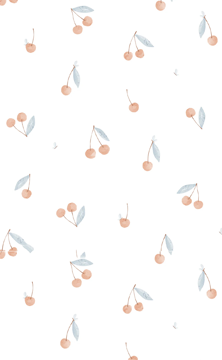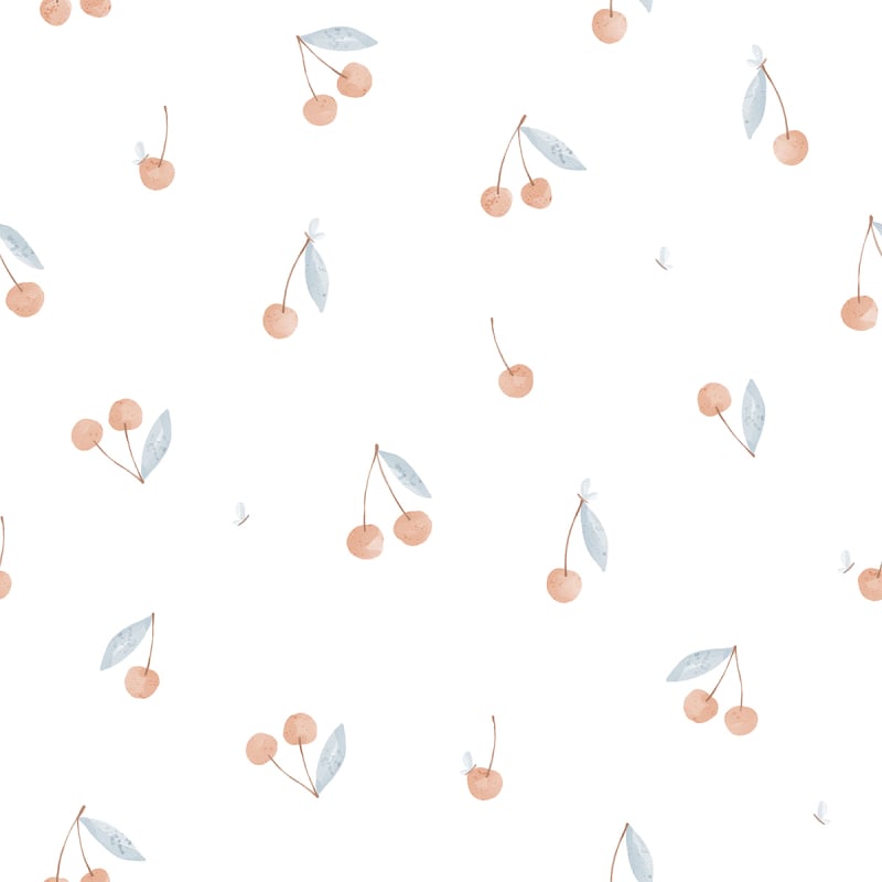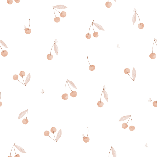 Cherry Cherie wallpaper features a fruit motif in a pictorial style. Cherries appear alone or in pairs, carried by thin stems. They are accompanied by elongated leaves with delicate contours. Small butterflies are invited into the decor and give an airy breath to the whole. Lilipinso infuses the drawing with a gentle atmosphere.