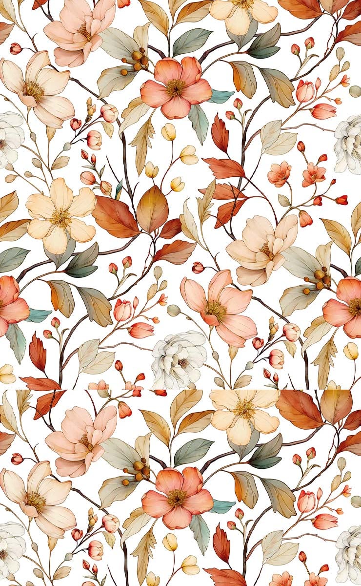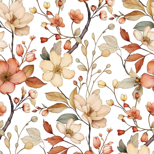The Louison wallpaper reveals a floral pattern with a fluid outline. Large blooming flowers, with open and slightly ribbed petals, mingle with buds and leafy twigs. The design has fine contours and a subtle gradient that evokes watercolor. This Lilipinso design composes a plant fresco, where each element suggests a garden in transition.