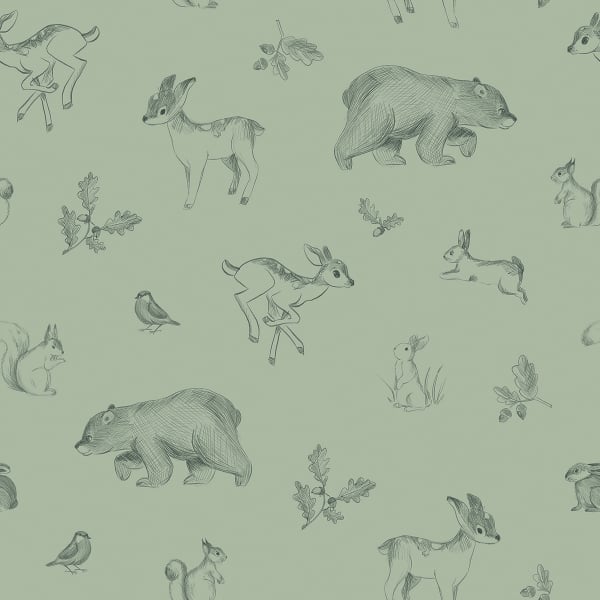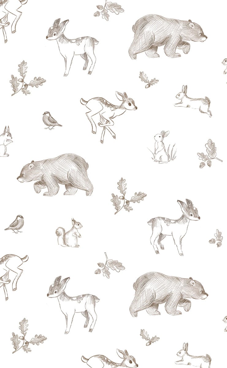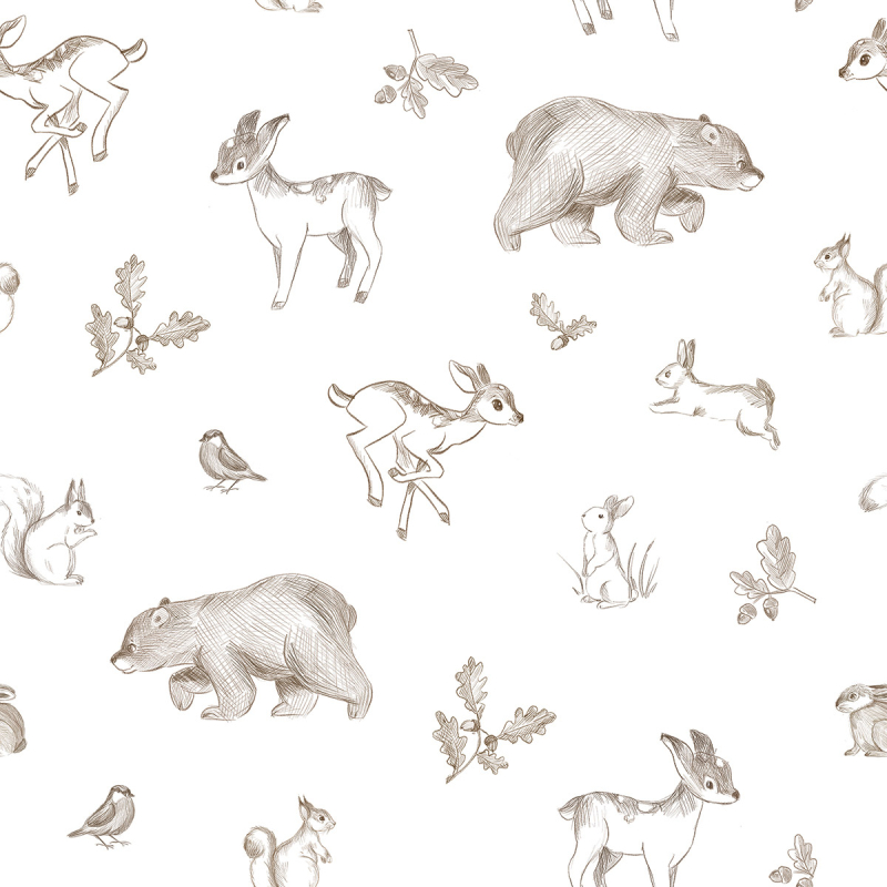 On Lilipinso's Natural wallpaper, the animals of the forest come to life under the tip of the pencil. The gaze follows the subtle lines of fawns, bears and squirrels, scattered between oak leaves and silhouettes of birds. The style is deliberately sketched, almost childlike, in a light monochrome that accentuates the delicacy of the whole.