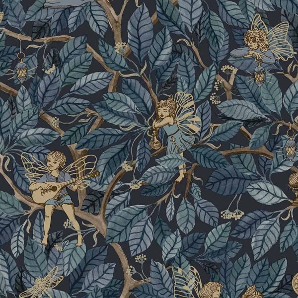 Fairies, a wallpaper by Borastapeter, unfolds a dense pattern of foliage evoking a forest canopy painted in watercolor. Golden touches highlight little fairies, dragonflies, and lanterns among the leaves. The elements overlap and intertwine, revealing meticulous details that structure the whole and enrich the design.