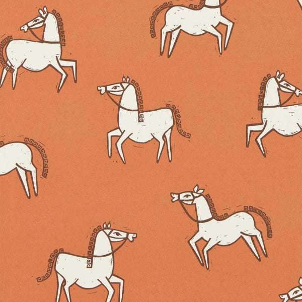 The Canter wallpaper, by Scion, features an animal motif where horses trot with a lively gait. Their silhouettes are marked with clear contours, giving a visual texture close to linocut. The manes and tails curl into graphic spirals, reminiscent of ancient ornaments or mythological figures. A joyful procession crosses the wall, carried by a free design.