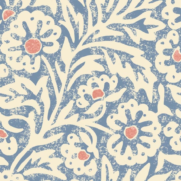 A stylized floral pattern, inspired by a stencil technique, extends over the Flower Patch wallpaper. Large rounded petals unfold among dense foliage, in a deliberately irregular composition. The shapes run through a textured background with a retro charm. Signed GP & J Baker, this wallpaper expresses an ancient ornamental language, both raw and delicate.