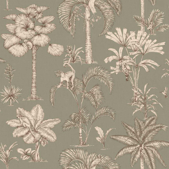 The Adele wallpaper reveals a tropical landscape where palm trees stand in an umbrella among animated fauna. The naturalistic motif sketches climbing monkeys, a hummingbird in flight, and an attentive woodpecker. The precise line dialogues with a solid background to dress the walls with a living botanical story. This Sandberg wallpaper evokes a distant world, observed with the meticulousness of an explorer's notebook.