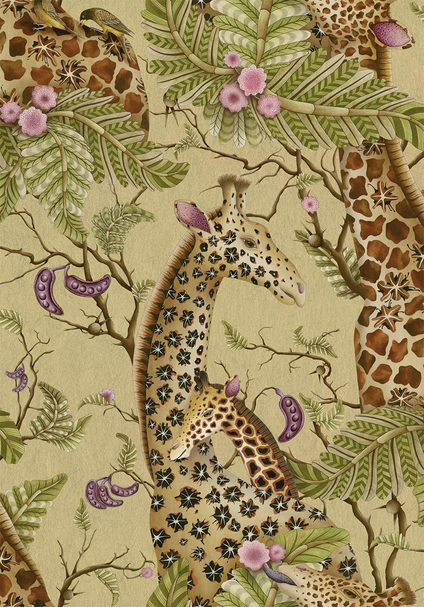 Royal Giraffe Gilded transforms wallpaper into a living painting, where a giraffe tenderly tilts its head towards its young. This hand-painted animal motif reveals every detail with ornamental precision. Acacia leaves and pods compose a harmonious landscape. The scene, designed by Cole and Son, comes to life against a textured background that makes the golden highlights vibrate.
