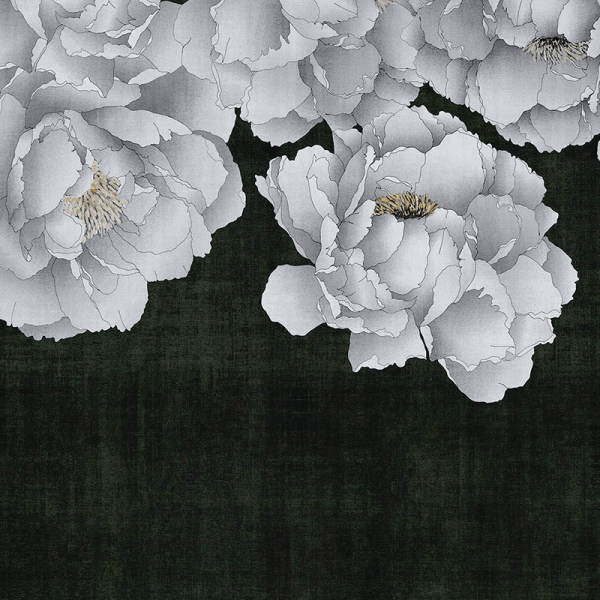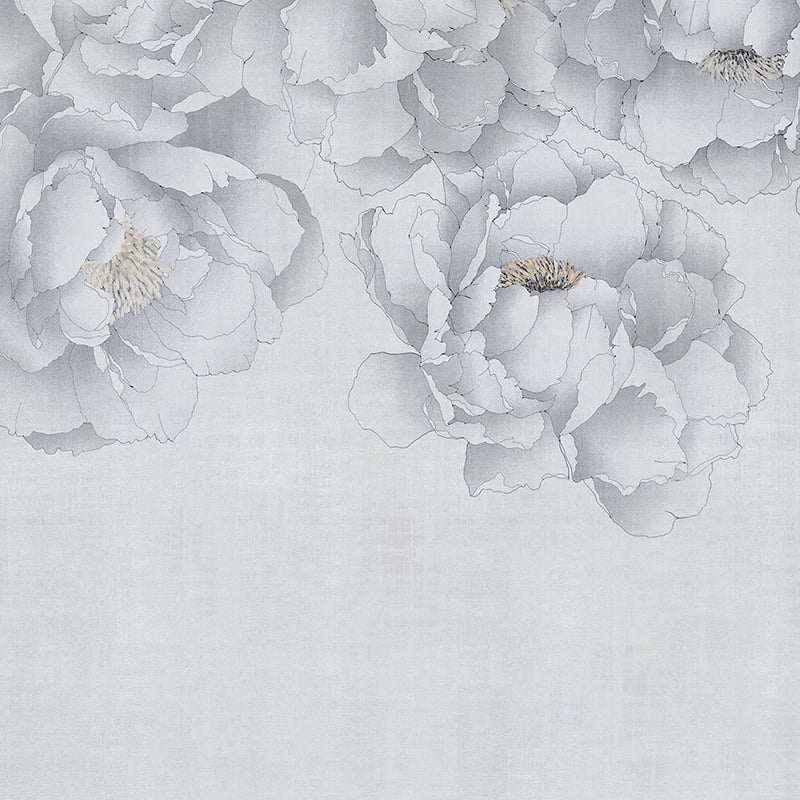 The Oriental Flowers panoramic wallpaper reveals an airy decor punctuated by large hand-drawn peonies. Their petals with delicate contours unfold in the upper part, as if suspended above a subtly textured background. The whole evokes a patinated veil, between floral softness and graphic lightness. A creation, signed Londonart, expressed in refined harmony.