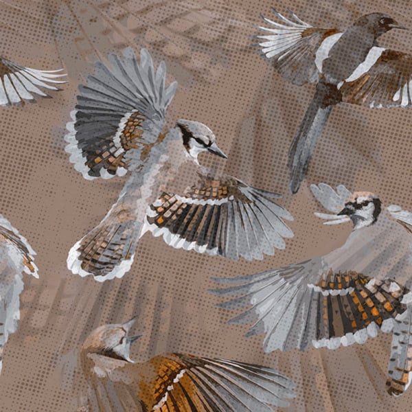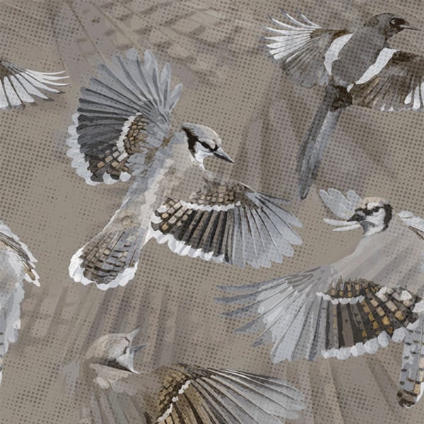 Symphonia is a panoramic wallpaper with an animal motif by Londonart. Birds in flight traverse its surface in an aerial graphic style. Their outstretched wings punctuate the composition and trace a silent and fluid ballet in space. Like a painter's canvas, the textured background adds a slightly irregular and tactile visual effect.