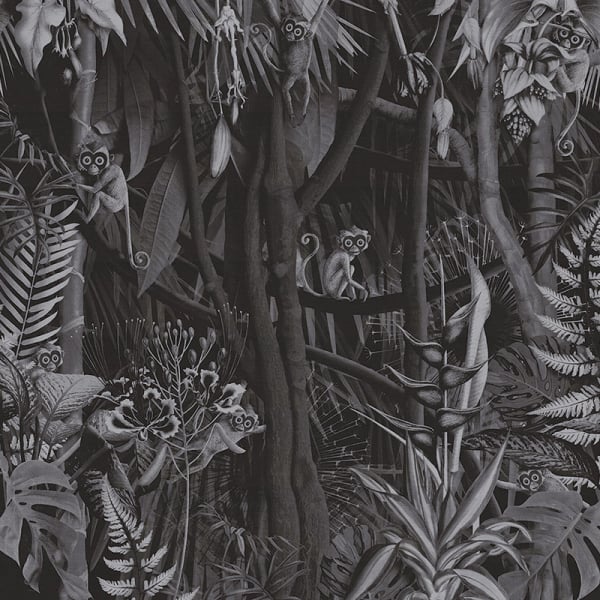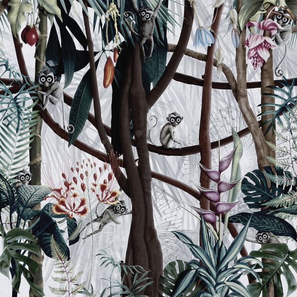 The panoramic wallpaper Looks in the Forest reveals a scene of lush jungle. Curious little monkeys sneak through exotic flowers and a tangle of dark foliage. The dense and meticulous design evokes a deep forest, full of secret life. Each element emerges from the shadows in an atmosphere that is both mysterious and vibrant.