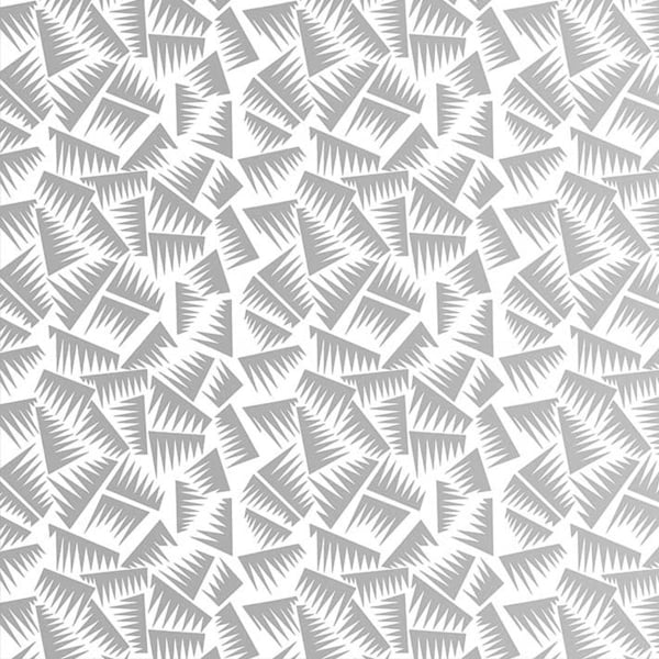 Jer is a graphic wallpaper published by LCE, inspired by a drawing from the 1920s during the Art Deco period. Its dynamic pattern juxtaposes triangular shapes bristling with regular points, oriented in all directions. This composition evokes a modern and vibrant stylization. The whole creates a dense visual rhythm, underlined by the contrast between light figures and dark background.